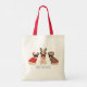 Niedliche Abbildung von drei Mops-Hunden in Weihnachtsbekleidung.