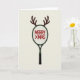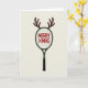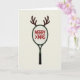 This cool card shows a tennis racket turned into a holiday symbol! 🎅🏼🎄 It's set against a plain off-white background with a dark forest green frame and black handle. The racket’s head has white strings in a circle and says "MERRY XMAS" in bright red. 🎁 What makes it special is the brown reindeer antlers curving out from the top, giving it a festive touch. It's a fun mix of sports and holiday cheer with simple lines and colors. This card is great for sports lovers and anyone feeling festive. 🎄 Spread some holiday joy with this awesome card!