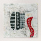 Eine spielerische Collage gemischte Medienstück in Acryl, Bleistift und Stift. Es enthält einen unordentlichen weißen Hintergrund mit Pop aus den unten liegenden Schichten, schwarz-weiße Elemente im Schachbrett, Blume und Streifen. Es endet mit einem Wirblen, loopy roten Akzent an der Spitze.
