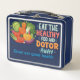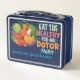 Das Lunch Box Design zeichnet sich durch den spielerischen Satz "Essen Sie gesundes Essen und Arzt weg" in einem lebendigen, farbenfrohen Schriftart aus. Der Hintergrund zeigt eine bunte und spielerische Szene mit verschiedenen Cartoon-Gemüsesorten, die alle lächeln und in einer lustigen und skurrilen Art arrangiert. Das Design fördert gesunde Ernährungsgewohnheiten und ermutigt die Kinder, ihre Mahlzeiten zu genießen und dabei gesund bleibe.