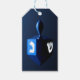 Ein modernistisches, metallisch blaues Dreieck vor einem dunklen, nächtlichen Hintergrund. Zwei der hebräischen Briefe, die auf einem dreifachen gefunden wurden, nun Nonne und glänzen, leuchten hell. Fügen Sie auf der Rückseite Ihren eigenen Text hinzu.
