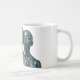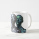 Three futuristic metallic women with closed eyes in chrome, blue, and green tones, centered on a white mug.