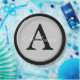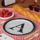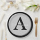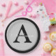 Personalisieren Sie diese silberne metallische Optik-Taste, die in Tellern mit schwarzem Rundpapier mit beliebigem Nachnamen und Single-Monogramm dargestellt ist.