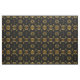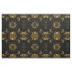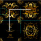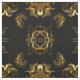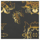 Ein sehr elegantes Stoffmuster mit großen, weitläufigen metallischen Goldverzierungen mit verzierten Blätter und Wirbel, verstreut auf einem schwarzen Hintergrund.