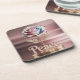 Dieser Untersetzer besticht durch eine Skulptur aus metallischer Rose, deren irisierende Blätter von Weiß zu Rosa zu Blau wechseln. Die Rose hat detaillierte vergoldete Kanten auf jeder Blüte und sitzt auf einem Goldstamm, der mit goldenen Blätter geschmückt ist. Das Wort "Friede" ist in weißem Text mit einer metallisch goldenen Oberfläche auf einer kreisförmigen goldenen Basis. Die gesamte Skulptur ist auf einem weichen, rosa und goldenen Hintergrund mit Rose. Die Beleuchtung reflektiert sanft den Goldboden, und die metallischen Oberflächen der Rose haben eine hochglänzende Oberfläche, die das Licht auffängt und ein luxuriöses, erstklassiges Aussehen schafft. Der Untersetzer ist ein harter Untersetzer aus Kunststoff mit Korkunterlage. Das Untersetzer-Set enthält sechs Untersetzer.