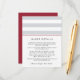 Diese schlichte und schicke Karte mit klassischer schwarzer Schrift, breiten, blassgrauen und weißen Streifen und einer kontrastierenden, dünnen Band festlicher Cranberry Rot wurde entworfen, um sich mit unserer Metro Stripe Cranberry Hochzeitskollektion abzustimmen. Ersetzen Sie den Beispieltext durch die Schlüsseldetails Ihrer Hochzeitsfeier oder Ihres Party. Fragen Sie, welche Informationen auf einer Hochzeitseinladung einfügen? Denken Sie an Details wie Hotelunterkünfte, Gruppennummern, Transport, Informationen über den Empfang und Ihre Hochzeitswebsite url.