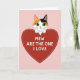 This greeting card shows a calico cat peeking out from behind a big deep red heart in the center. The cat has a white face with orange and black patches, and bright green eyes that look sweet and a little curious. The heart is outlined with white dashed stitches, like it was sewn by hand, which adds a cozy, caring feel. Inside the heart, the message “MEW ARE THE ONE I LOVE” is written in white block letters that are easy to read. The text sits right in the middle of the heart, so it’s the first thing you notice. A soft pastel pink background fills the rest of the card and keeps the focus on the cat and the message. It’s a simple, warm design that fits romance or friendship perfectly ❤️💌🍫.