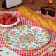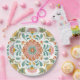 These bachelorette party plates have a floral talavera style tile design. Colors include blue, yellow, pink, white and coral.
