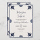 Dieses mexikanische Blue Floral Otomi Simple Fiesta Wedding Invitation Design besticht durch eine einfache und elegante Grenze mit dunkelblauen Blumen- und Vogelelementen, die in jeder Ecke delikat platziert sind. Der zentrale Bereich wird leer verlassen, gerahmt durch eine dünne blaue Linie, die einen sauberen und minimalistischen Hintergrund für den Text bietet. Die Kombination von Vögeln und Blume und die zurückhaltende Farbgebung verleihen dem Design ein raffiniertes und dennoch traditionelles Aussehen, das von mexikanischen Volksmotiven inspiriert wird.