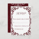 Celebrate your special day with this Burgundy Rustic Wedding RSVP Card, inspired by rustic elegance and natural earthy tones. Delicate white floral lace motifs on a warm Burgundy background create the perfect blend of rustic charm and timeless beauty. Ideal for outdoor, boho, or destination weddings, this RSVP card coordinates perfectly with the matching Burgundy Rustic Wedding Invitation and is fully customizable with your own wording and colors.