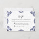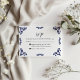 This Mexican Talavera Black Floral Minimalist Wedding RSVP Card design features a minimalist approach with delicate, symmetrical orange black motifs placed in each corner and along the edges. The small, leaf-like shapes create a sense of movement while maintaining an airy, open space in the center, allowing for ample text placement. The simplicity and elegance of the pattern evoke traditional Talavera tiles, giving the design a classic Mexican artisanal feel.