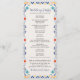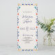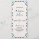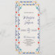 Dieses mexikanische Talavera Majolica Floral Aesthetic Wedding Program zeigt eine fröhliche und festliche Grenze mit folkloristischen Blumenmotiven in lebhaften Farbtönen wie Rot, Orange, Gelb, Türkis und Marineblau, Set vor einem warmen, leicht strukturierten cremefarbenen Hintergrund. Der Rahmen ist mit stilisierten Blume, Ventilatormustern und gebogenen Zierakzenten zart detailliert und verleiht ihm ein handgefertigtes, gemaltes Aussehen. Der zentrale Leerraum bietet eine saubere und einladende Leinwand, die sich ideal für Veranstaltungen, Menükarten oder Feierlichkeiten mit einem kulturellen oder handwerklichen Flair eignet.