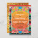 Farbenfrohe mexikanische Fiesta Wedding Ankündigung. Mit hellen papel picado inspirierten Blume, IMITATEN goldenen Glitzer Akzente, Maracas und einem aztekischen mexikanischen Teppichboden. Viele passende Hochzeitsartikel für diesen Gegenstand