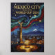 A bold soccer artwork capturing Mexico City vibrant cityscape and stadium energy, highlighted by a glowing golden football and expressive painterly motion. Designed for football fans and art lovers seeking a unique and powerful visual statement.