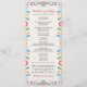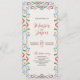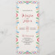 Dieses mexikanische elegante und farbenfrohe Fiesta Wedding Program besticht durch eine große rechteckige Struktur mit einem cremefarbenen Hintergrund, der durch lebhafte, symmetrische Blumenrahmen gerahmt ist. Helle Farbtöne wie Rot, Blau, Orange, lila, Grün und Gelb schaffen mit dekorativen Blume, Blätter, Wirbel und Maraca-Akzenten ein lebendiges und festliches Ambiente. Der zentrale Leerraum ist sauber und gepflegt und eignet sich hervorragend, um wichtige Texte wie Einladungen, Veranstaltungsprogramme oder feierliche Ankündigungen hervorzuheben.