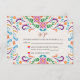Diese elegante mexikanische Fiesta Wedding RSVP Card bietet einen weichen, hellen Hintergrund mit lebhaften Blumenelementen und dekorativen Elementen, die oben, unten und an den Seiten eingerahmt sind. Die farbenfrohen Blume, die wirbelnden Weinreben und die Blattmuster werden durch die kräftigen Rosa-, Orange-, Grün-, Blau- und lila-Farbtöne unterstrichen und verleihen diesem Ort ein festliches und spielerisches Ambiente. Die symmetrische Anordnung und die lebhaften Motive schaffen ein ausgeglichenes, energetisches Aussehen, das perfekt für ein fröhliches und elegantes Hochzeitsgeschenk geeignet ist.
