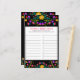 Beantwortungsblatt mit mexikanischem Fiesta Blume Design personalisiert für den Anzug Ihrer Veranstaltung, wie Brautparty, Babydusche, Paardusche. Farbenvolles Blumendesign mit Blume im Stil der Volkskunst in Rosa, lila Rot und Gelb. Ideal für alle Fragen und Ratings zu Hochzeiten oder Brautpartys mit nummerierten Zeilen, damit Ihre Gäste bis zu 20 Antworten zusammenfassen können.