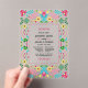 Set Sie den Ton für Ihr Probe-Dinner zum mexikanischen Fiesta-Thema mit dieser atemberaubenden Acryleinladung. Mit einem lebendigen volkstümlichen Design mit farbenfrohen Blumen und Vögeln erweckt diese Einladung die Freude und den Charme eines traditionellen Fest. Das durchsichtige Acryl fügt eine moderne und elegante Drehung hinzu, die sich perfekt für Paare eignet, die mit einer Mischung aus Tradition und zeitgenössischem Flair feiern. Vollständig anpassbar für Ihre individuelle Veranstaltung.