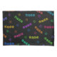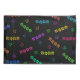 Ein Muster für Katzenliebhaber mit dem Wort "miau", das mit einem Pfotendruck-Schriftart in einem farbigen Regenbogen auf schwarzem Hintergrund geschrieben wurde. Niedliche, farbenfrohe kitty-Gesichter runden das Design ab.