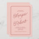 Diese Einladung zur Hochzeit besticht durch ein elegantes und modernes Design mit einem weichen rosa Hintergrund und tiefrotem Text. Die Namen werden in einem stylischen, fließenden Skript-Schriftart präsentiert, der eine Touch von Romantik und Raffinesse hinzufügt. Die Erholung der Details, einschließlich des Hochzeitdatums, der Uhrzeit und des Ortes, werden in einem sauberen, minimalistischen Sans-Serif-Schriftart präsentiert, um die Lesbarkeit zu erleichtern. Ein dünner, abgerundeter, rechteckiger Rahmen bildet den Rahmen und verbessert so die durchdachte Ästhetik. Die Kombination aus weichen Pastelltönen und klassischer Typografie macht diese Einladung perfekt für eine schicke und zeitlose Hochzeitsfeier.
