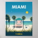 Das Retro Miami Florida Reiseplakat mit Blick auf eine Rettungsstation an einem von Palmen gesäumten, sonnigen und sandigen Miami Beach. Dieses Vintage Design bringt Erinnerungen klassischer Reiseplakate aus vergangenen Zeiten zurück.