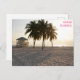 Nichts lässt mich mehr an Zuhause denken als diese Postkarte. Hier ist ein schöner Strand im Morgengrauen abgebildet. In der Ferne sehen Sie Palmen und ein Strandhaus. Blauer Himmel und warme Sonne sind hier immer auf der Tour.