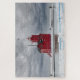 Helles rot-Michigan rotes Leuchtturm im Winter mit stürmischen Himmeln.