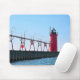 Ein lebendiger, roter South Haven Leuchtturm in Michigan steht am Ende eines Pier hoch und steht im Kontrast zum blauen Himmel
