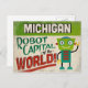Eine lustige Reisepostkarte im Michigan-Jahrgang mit einem freundlichen Roboter im Retro-Stil, der sagt: "Michigan, Roboter-Hauptstadt der Welt!"