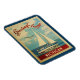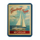 Diese Grüße aus Michigan Vintage Reise nautische Design verfügt über ein Boot auf dem Wasser mit Möwen und einen blauen Himmel gefüllt mit prächtigen puffigen weißen Wolken.