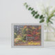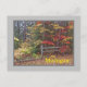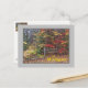 POSTKARTE VON MICHIGAN LANDSCHAFT MIT BÄUMEN IN HERBSTFARBEN VON ROT, ORANGE UND GOLD MIT HOLZSCHIENENENZENTRUM VOR. FALLENE BLÄTTER KARPETIEREN DEN BODEN.