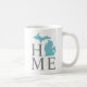 Die stilvolle, benutzerdefinierte Kaffeemaschine-Tasse zeichnet sich durch ein typografisches Design mit "Zuhause"-Text und Michigan-Staat-Karte aus. Klicken Sie auf die Option Anpassen, um den Marker für die weiße Herzstadt auf beiden Seiten der Tasse zu verschieben. Sie können es direkt über die Stadt, wo Sie leben, oder Ihre Heimatstadt positionieren. Holzkohle grau, Aquablau und weiß.