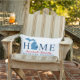 Stilvolles Begrüßungskissen mit "Zuhause"-Text mit Michigan-Staat-Karte und individuellem Text, der mit Ihrem Familiennamen und der Stadt, dem Staat, in dem Sie leben, personalisiert werden kann. Die navy blauen Herz-Stadt Marker können über Customized an den entsprechenden Ort verschoben werden. Horizontale Streifen ziehen die Rückseite an. Rot, Weiß, Blau und Marinefarben.