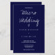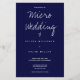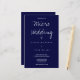 Eine Hochzeitseinladung auf Budget Papier für eine Mikro-Hochzeit. Diese leichtgewichtige Papiereinladung wird in dunkelblau und weiß gemacht, mit gerade genug Informationen, um den Tag zu gewinnen. Fügen Sie einfach Ihre Informationen hinzu, fügen Sie diese zu Ihrem Warenkorb, und genießen Sie Ihre kleine und intime Hochzeit. (Auch die Option Satinpapier ist sehr dünn und Halbglanzpapier wird vorgeschlagen.) (Die Sammlung enthält Versionen dieser Einladung zu schwereren, traditionelleren, Papiertypen) Micro Wedding Dark Blue Typografy Budget Paper Invitation Holidayday Design | ©Melissa Patton Designer