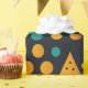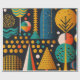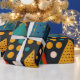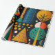 Unique abstract Christmas wrapping paper featuring a retro, geometric pattern of trees, circles, and triangles in a contemporary palette of teal, orange, mustard yellow, and dark gray.