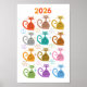 Dies ist ein Kalenderposter für 2026 mit mid-century bunte Atomkatzen mit Atom-Starbursts in rot, grau, türkis, orange, grün, pink und blau, Es ist ein perfektes Neujahr-Geschenk für Katzen-Damen, Katzenliebhaber und diejenigen, die mid-mod Stil lieben
