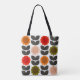 This seamless retro floral pattern features bold groovy flowers in warm, earthy mid-century colors, arranged in a clean, repeating grid. The design combines saturated reds, oranges, olive greens, and soft neutrals, capturing the unmistakable character of 60s and 70s vintage aesthetics.