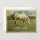 Midland Texas ländliche Vintage Reise Postkarte. Es zeigt ein weißes Pferd Weiden auf grünem Gras mit Zaun und blauen Wolken Himmel oben. Ein lustiges Landwirtschaftsimage mit rustikalem Charme.