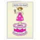 Eine Cartoon-Dame in einem rosa Kleid steht auf einem riesigen Kuchen und hält einen Cocktail. Sie ist Sprichwort "Midlife crisis ahead".