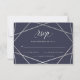 Diese stilvollen Bat Mitzvah RSVP Karten sind mit einem silbernen geometrischen Muster auf einem reichen dunkelblauen Hintergrund mit moderner weißer Typografie versehen.