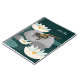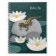 A detailed and naturalistic flat-style illustration of a fire salamander — rendered in dramatic black with vivid yellow spots — crawling across smooth grey rocks, surrounded by elegant white water lilies in a deep teal pond. The high contrast between the salamander's markings and the soft background creates a striking visual. This art piece appeals to nature enthusiasts and collectors of unique botanical and wildlife art.