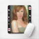 Hübsches Mädchen betrachtet Sie, während Sie an Computer mit dieser großen Mausunterlage arbeiten.