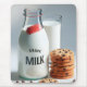 Eine klassische Glasmilchflasche mit "DRINK MILK" bedruckt neben einem vollen Glas Milch und einem Stapel Schokoladenkekse mit ein paar verstreuten Schokoladenchips