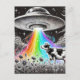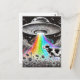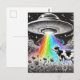 Eine Milchkuh schaut sich ein UFO an, das Regenbogenstrahlen in einer Wildblume-Wiese, die von der KI generiert wurde, abstrahlt