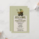 Eine vom Militär Babydusche-Einladung mit Illustration eines Babywagens mit großen Reifen oben. Grüner Hintergrund vorne und hinten. Personalisieren Sie den Text mit Einzelheiten Ihrer Veranstaltung.
