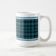 Kaffee-Tasse mit dem Tartan für Clan Miller und seine Stücke. Hellblau und grün schottisches kariertes Muster aus dem Jahr 1998, mit marinebasierten und gelben Akzenten.