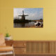 Ein gut aussehender Keeshond stellte sich vor einer Windmühle und einem Kanal in seinem Heimatland Holland.