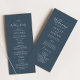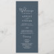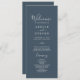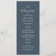 Dieses kleine blaue Hochzeitsprogramm aus Blatt ist perfekt für eine elegante Hochzeit. Die Silhouette ist schlicht und grün in dunkelgraublau mit klassischem minimalistischem Stil. Geben Sie den Namen des Paares, das Hochzeitsdatum und den Ort, Dankeschön-Nachricht, Dienstorden, Hochzeitsfeier und ein optionales "in Loving Memory"-Denkmal ein.