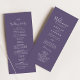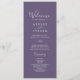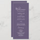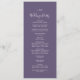 Dieses lila Hochzeitsprogramm mit Pflaume ist perfekt für eine Hochzeit. Die schlichte Silhouette der grünen Blätter in dunkelblauer Veilchenform, die mit minimalistischem Boho-Stil lila ist. Geben Sie den Namen des Paares, das Hochzeitsdatum und den Ort, Dankeschön-Nachricht, Dienstorden, Hochzeitsfeier und ein optionales "in Loving Memory"-Denkmal ein.