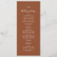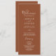 Dieses minimale Blatt Terracotta Hochzeitsprogramm ist perfekt für eine Hochzeit. Die Silhouette ist schlicht und besteht aus einem grünen Blatt in erdbrauner Orange mit minimalistischem Wüstenböhmischen Stil. Geben Sie den Namen des Paares, das Hochzeitsdatum und den Ort, Dankeschön-Nachricht, Dienstorden, Hochzeitsfeier und ein optionales "in Loving Memory"-Denkmal ein.